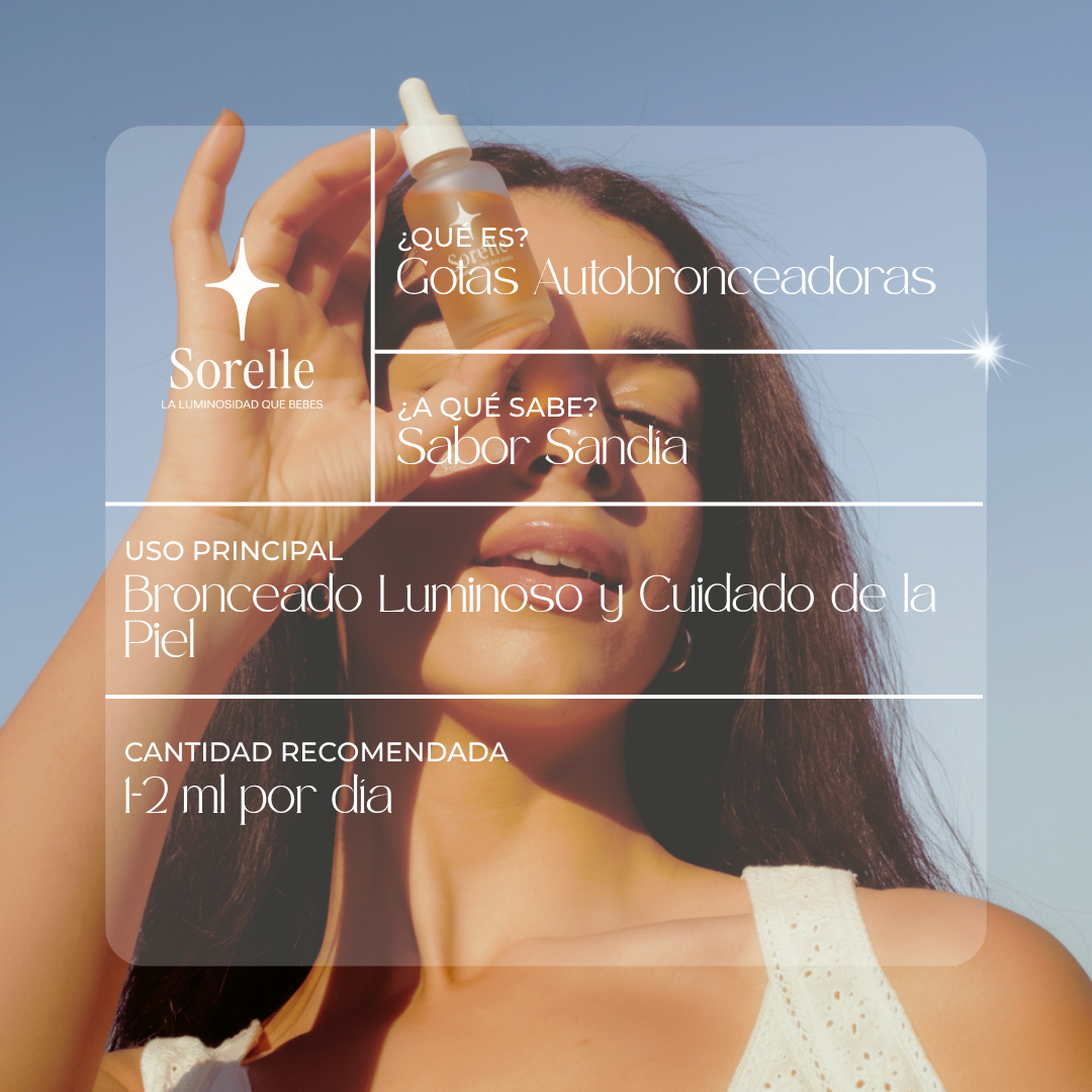 Descubre las Gotas Sorelle©, la nueva forma de lucir un tono dorado y natural en solo 5 segundos. Con ingredientes 100% naturales, fórmula hidratante y sin manchas, olvídate de los autobronceantes y las cápsulas. ¡Una piel radiante, uniforme y saludable con cada gota!
